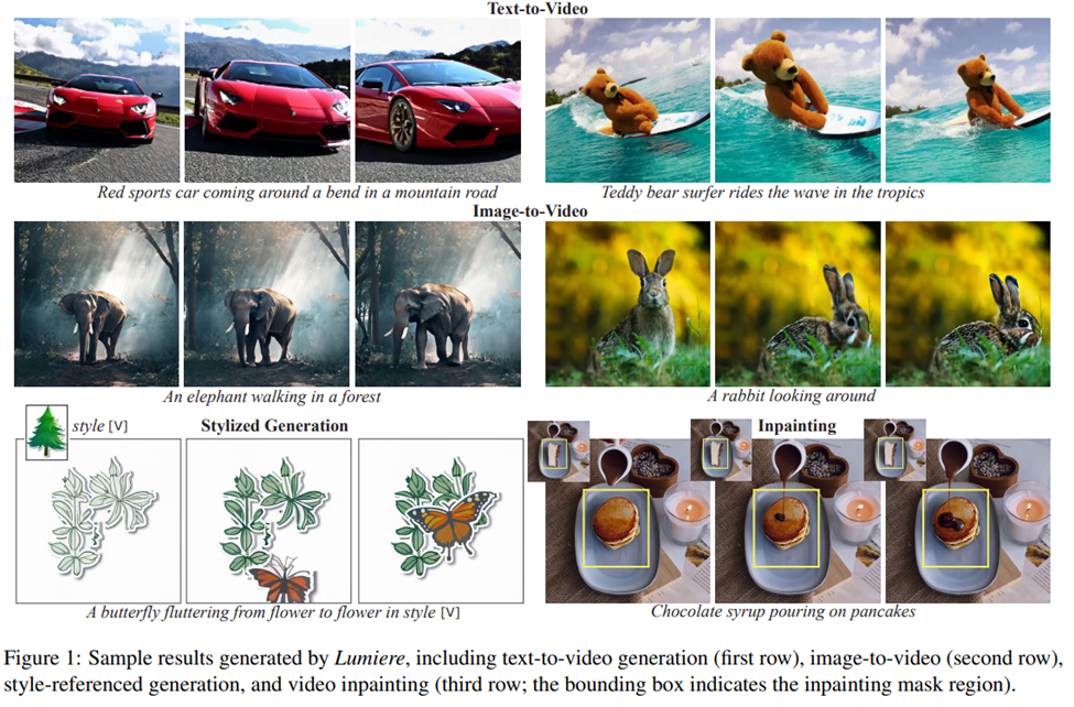 On January 23rd, 2024, Google announced their video generation model, Lumiere, with a preprint paper titled “Lumiere: A Space-Time Diffusion Model for Video Generation”. The model can do text-to-video generation, image-to-video generation, style-referenced generation, and video inpainting. Lumiere uses a space-time diffusion model based STUNet (Space-Time U-Net) architecture, which generates the whole temporal duration of video at once to maintain global temporal consistency, rather than synthesizing keyframes based on temporal super-resolution used by existing video models. The generative results from Lumiere in the paper demonstrated the high-quality and realistic generated videos and users’ preferences compared to the baselines. Lumiere is a latest AI tool for video generation, however, it can not be used for composing videos for multiple shots or making transiting between scenes. Also, the model is kept to Google’s own use, and no word regarding when the model will release to the public.